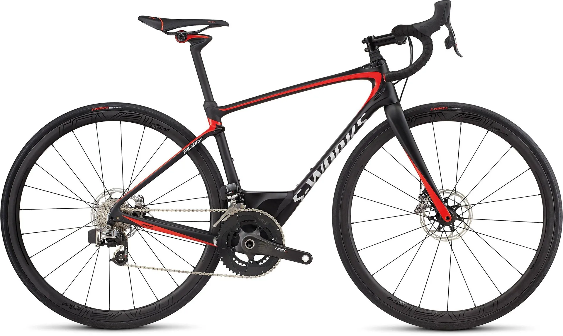 We've known for years that smoother is indeed faster but until the S-Works Ruby with SRAM eTap came along we had no idea just how right we were. The frame is among the lightest that we've ever made and it's been constructed from our top-end FACT 11r carbon fibre. Its stiffness levels are also off the charts and compared to the sl4 iteration of yesteryear you'll experience a whole new faster and more efficient geometry. Through some engineering sorcery however we've managed to keep the same fit feel and position that we've all come to love from the sl4's women's endurance geometry. Of course you're probably thinking "get on to the suspension thing up front." we call it future shock and essentially it's a piston in the head tube with 20mm of travel. We developed this technology in partnership with McLaren applied technologies and the result of this are a host of drastic performance improvements namely in the vertical compliance department. Without giving a physics lecture we found that focusing on vertical compliance instead of fork splay meant that we could improve smoothness speed and comfort in one fell swoop. And of all the bikes that we've tested with our rolling efficiency model the new Ruby outperforms anything on the market. Lastly we spec'd it with awesome components like sram's revolutionary eTap shifting hydraulic disc brakes our new CLX 32 disc wheels and a whole host women's-specific comfort features